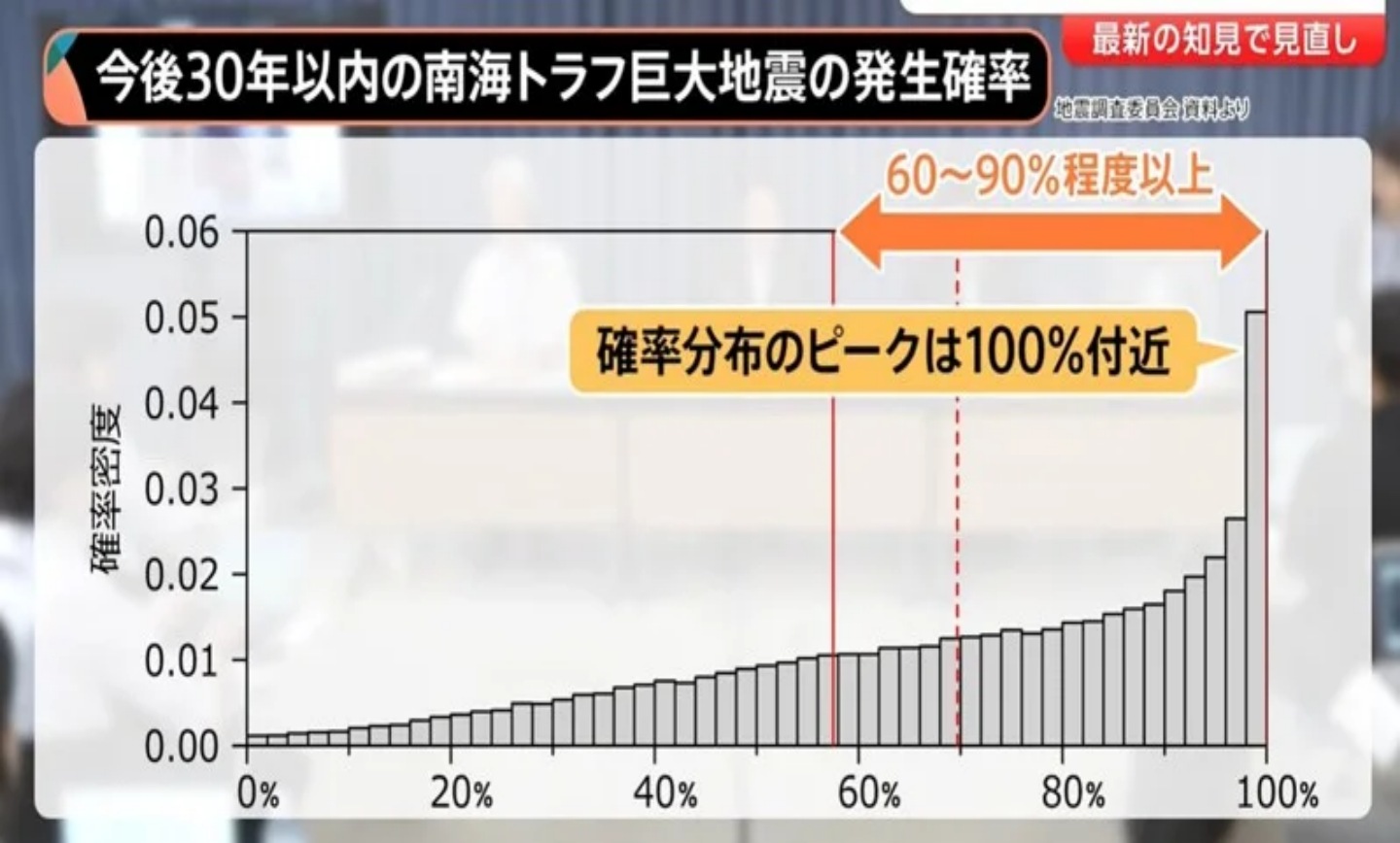 日本放送協會(NHK)報導,日本政府地震調查委員會26日公布最新評估,將南海海槽大地震在未來30年內發生規模8以上強震的機率,從原本的約80%上修為「約60%到90%以上」。同時,若僅依地震平均發生間隔計算,數值為「20%到50%」。委員會強調,雖然數值範圍有所不同,但不論哪一種計算方式,都顯示大地震發生的切迫性極高。南海海槽大地震是指可能發生在靜岡縣外海至宮崎縣外海之間的超大型地震,預估規模達到8級以上,一旦爆發,最嚴重恐造成近30萬人死亡。由於該區域約每隔100至200年便會出現一次大地震,上一次發生已距今約80年,因此專家普遍認為「隨時可能再度來襲」。本次委員會之所以給出兩2組機率範圍的數字,與計算方法差異有關。傳統推算是依據高知縣室戶市港口的地殼隆起紀錄,但因古文書中的水深記載存在爭議,研究團隊重新檢驗誤差後,算出「60%至90%以上」的範圍。若完全不使用隆起資料,只根據地震平均發生間隔計算,則得到較低的「20%至50%」。委員會強調,兩種方法沒有高下之分,單純反映科學的不確定性。地震調查委員會委員長平田直雄指出,雖然數字存在落差,但核心訊息不變,「無論如何,地震隨時可能發生」。他補充,「如果要用數字表達現在的情勢,90%以上是貼近實際的高值」,但不代表30年內必然發生,關鍵在於要正確認知不確定性。東京大學教授關谷直哉也則指出,單純公布機率容易讓人混淆,政府應更著重於如何引導民眾把風險意識轉化為具體的防災行動。名古屋大學減災聯合研究中心主任鷺谷威也提醒,20%至50%雖看似較低,但對於巨大地震而言仍是高風險,不能掉以輕心。他強調,專家共識是「未來必然會發生,只是時間點不確定」,因此建物耐震補強、家具固定,以及高風險地區的海嘯避難路線確認,都必須盡快落實,以免災害發生時釀成無法挽回的慘重後果。