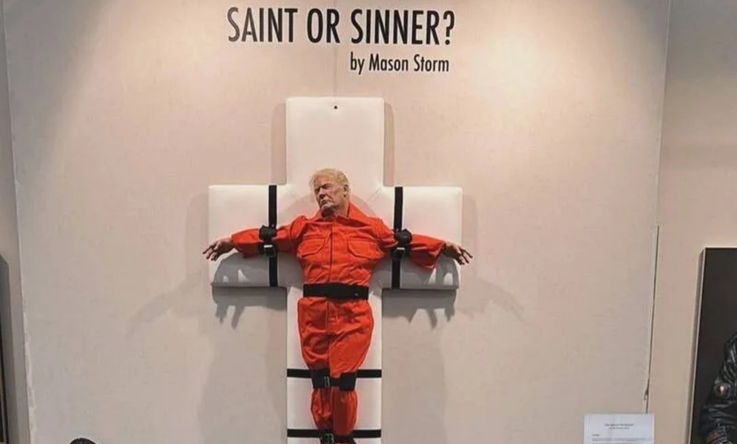 這件作品名為「聖人還是罪人」(Saint or Sinner),由英國藝術家史托姆(Mason Storm)創作,呈現川普身穿囚服、閉著眼睛、身體橫躺於略微傾斜、帶有軟墊的白色十字架上,營造出可能被釘十字架受難或接受注射死刑的氛圍。