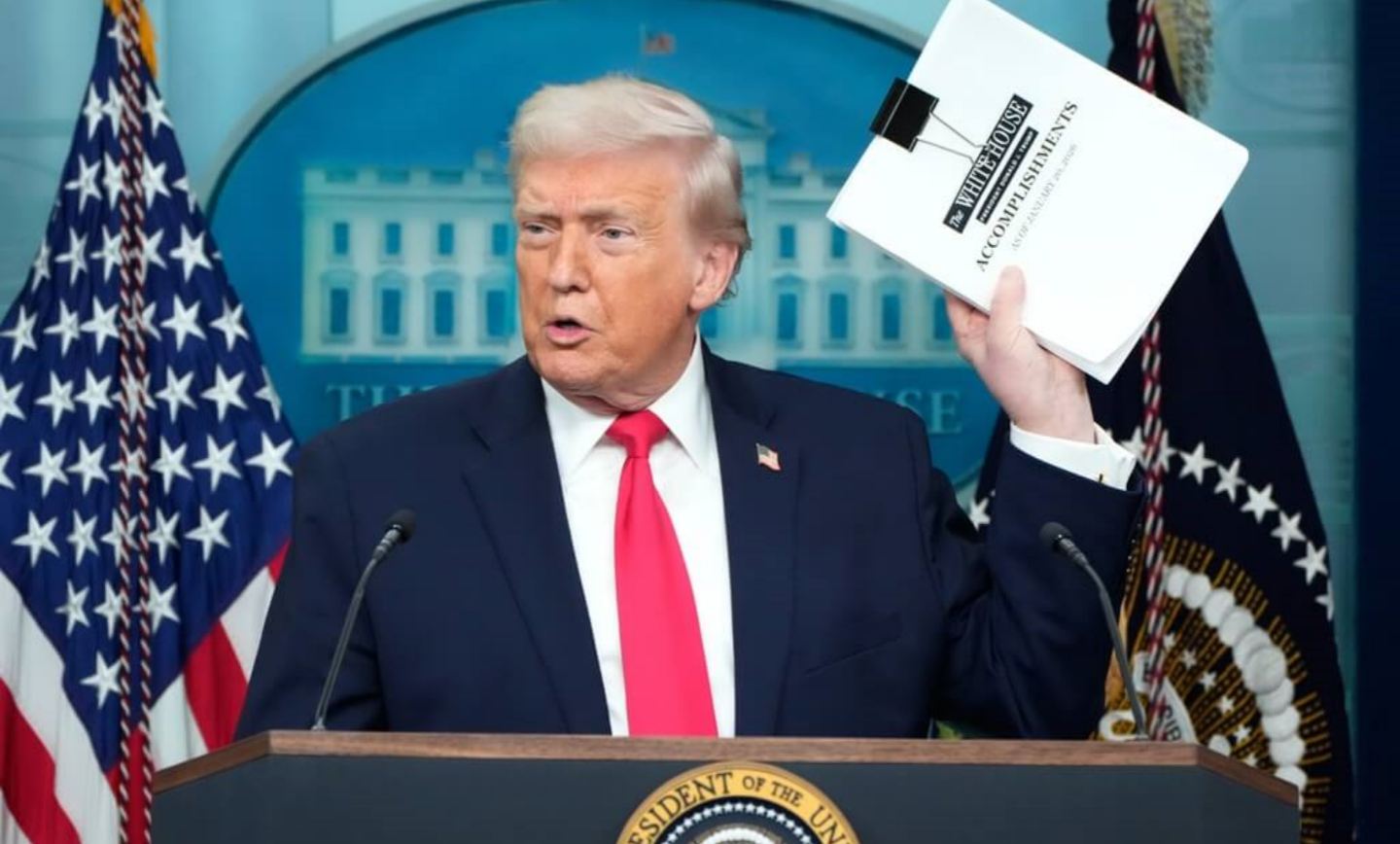 川普在記者會上展示一大疊寫滿執政週年成就的文件並細數經濟成長、邊境安全、降低通膨、簽署貿易協議降低美國商品出口障礙、企業承諾擴大對美投資、美軍逮捕委內瑞拉前領導人馬杜洛(Nicolas Maduro)及打擊伊朗核設施等政績。