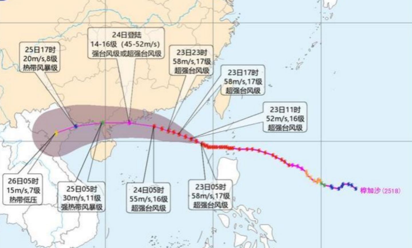 預計,「樺加沙」將以每小時20公里左右的速度向西偏北方向移動,將於24日在廣東深圳到徐聞一帶沿海登陸,登陸後轉向偏西方向移動,強度逐漸減弱。
