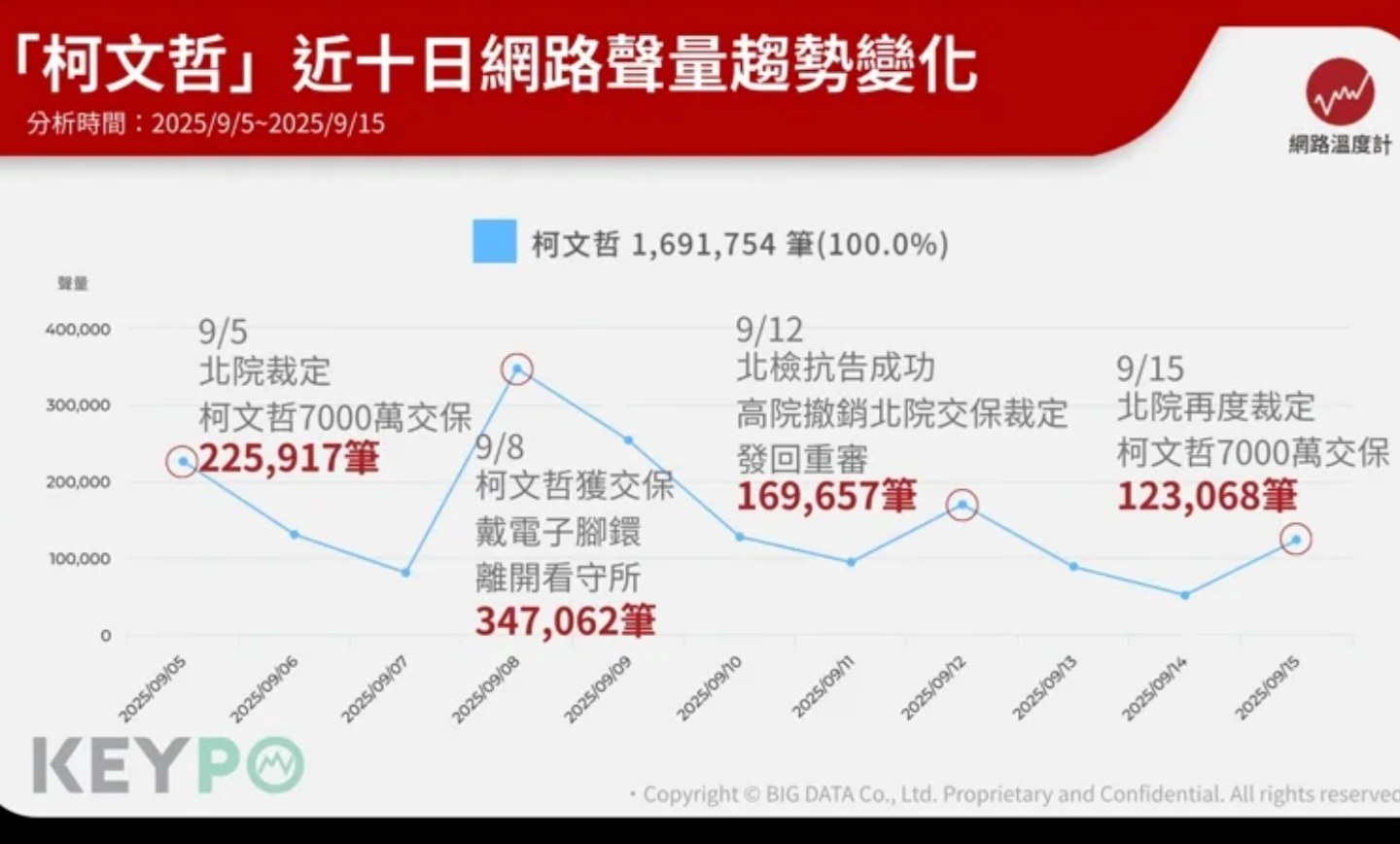 《網路溫度計DailyView》透過輿情分析軟體《KEYPO大數據關鍵引擎》觀察,「柯文哲」近十日(2025/9/5~2025/9/15)網路聲量累積超過169萬筆。聲量最高點出現在9月8日,單日累積347,062筆,柯文哲發文表示,「謝謝大家,阿北回來了!」他強調,「絕不投降,絕不屈服!繼續努力!」不少支持者留言,「阿北瘦好多,要好好調理身體」、「阿北你真的辛苦了」。