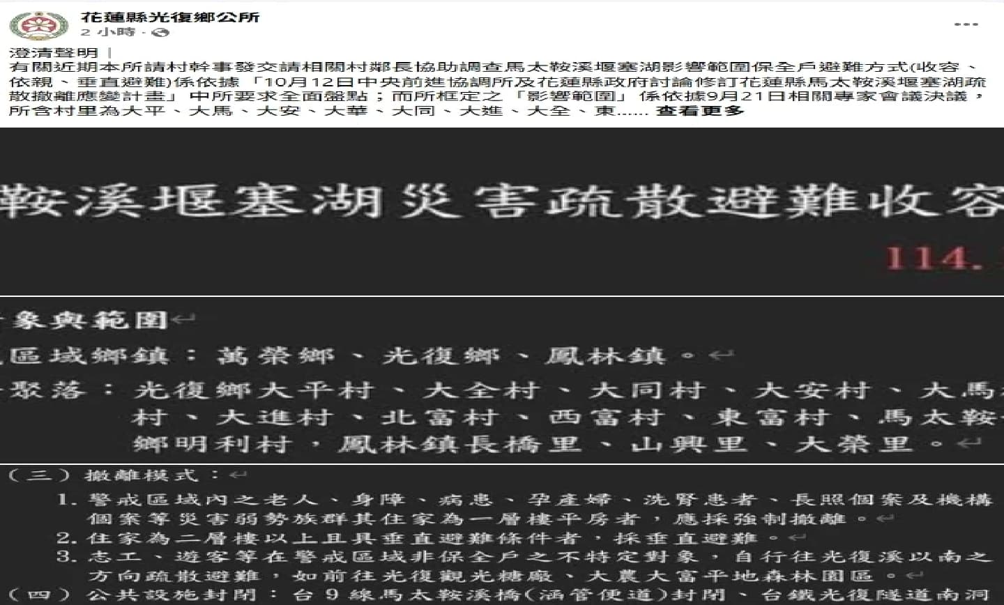 光復鄉公所也在一早發出澄清,表示是依據「10月12日中央前進協調所及花蓮縣政府討論修訂花蓮縣馬太鞍溪堰塞湖疏散撤離應變計畫」中要求的全面盤點,而框定的「影響範圍」,是依據9月21日專家會議決議所含的大平、大馬、大安、大華、大同、大進、大全、東富、北富及西富,共10村。