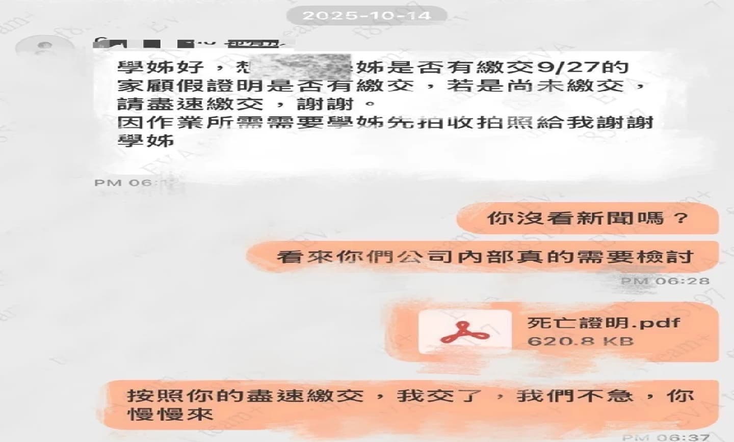 家屬則嗆,「你沒看新聞?看來你們公司內部真的需要檢討」,隨即貼上死亡證明,並再回「按照你的儘速繳交,我交了,我們不急,你慢慢來」。