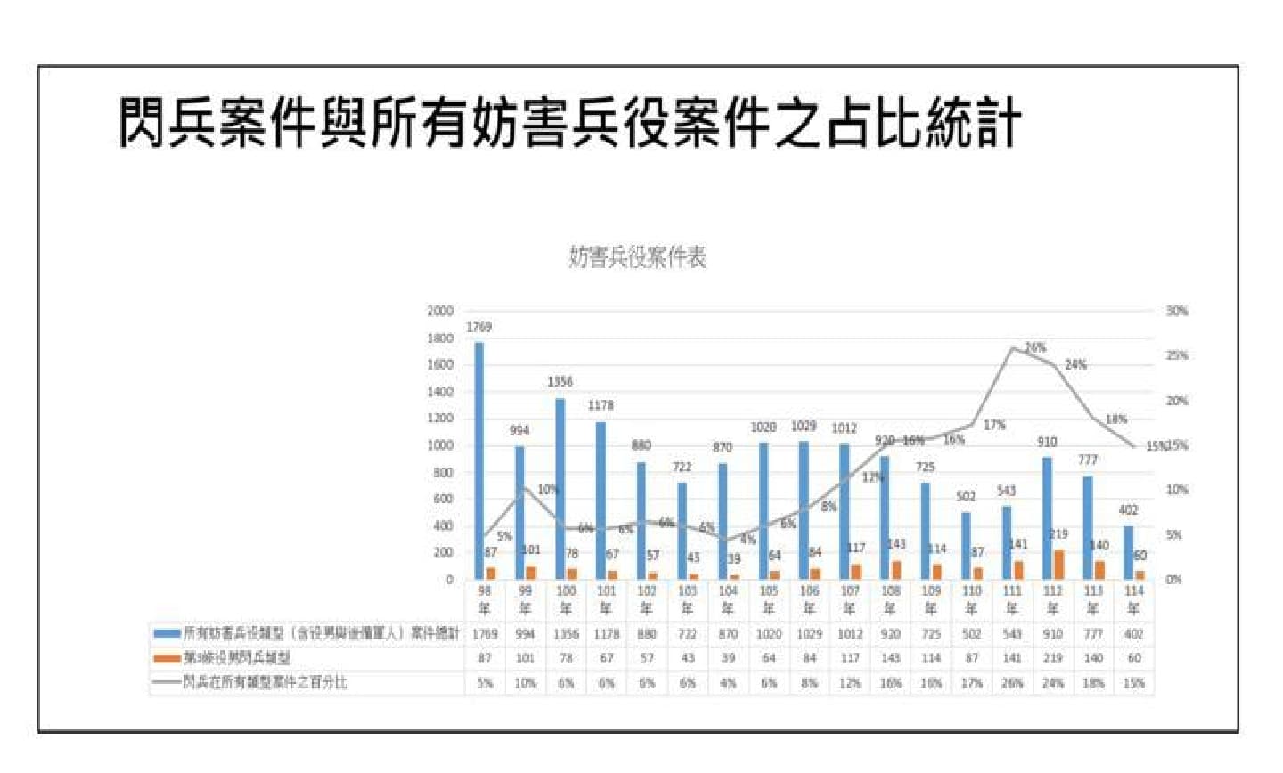 根據法務部法學研究中心統計,1999年至2025年9月,涉犯閃兵案件共有2198人,其中1670人遭起訴,528人獲緩起訴處分;案件中以役男滯留境外最多(1012人),其次為無故不接受徵兵檢查(437人)、逾期5日未入營(417人)。