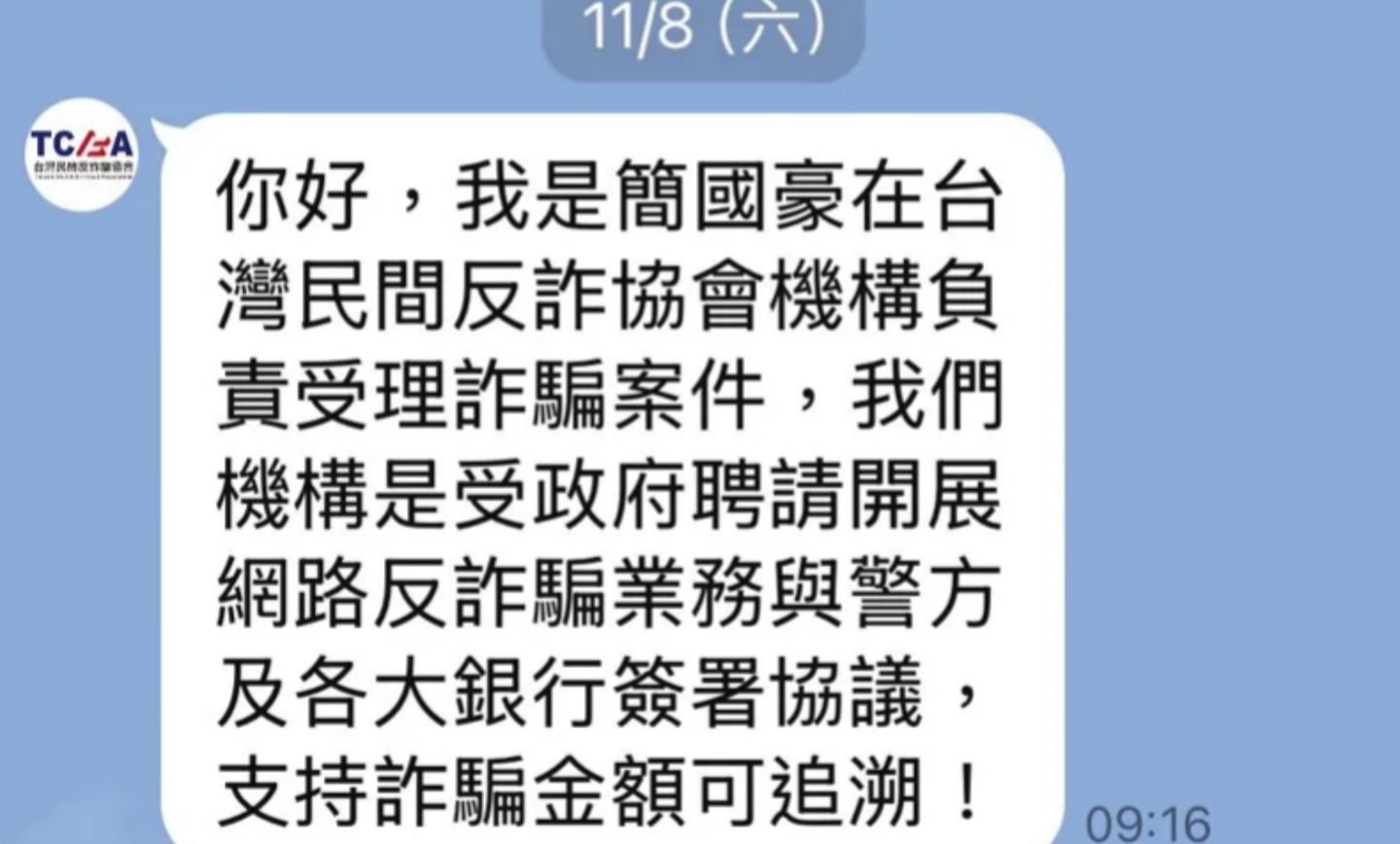 台灣民間反詐騙協會表示,今天接獲民眾反映,有詐騙集團冒充「台灣民間反詐騙協會」名義,甚至假稱「受政府聘任、與警方及銀行簽署合作協議」,並盜用協會LOGO作為LINE頭像,藉此博取信任。