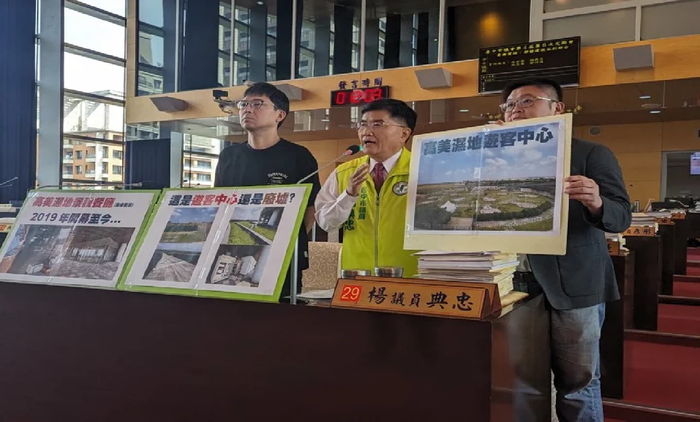 台中市議會今天質詢都市建設水利業務,民進黨議員楊典忠、林祈烽、鄭功進、施志昌聯合質詢。楊典忠表示,市府耗資3.6億元打造的高美濕地遊客中心,去年受到颱風侵襲,露營區受損嚴重、滿目瘡痍,景觀餐廳也關閉,目前宛如廢墟。