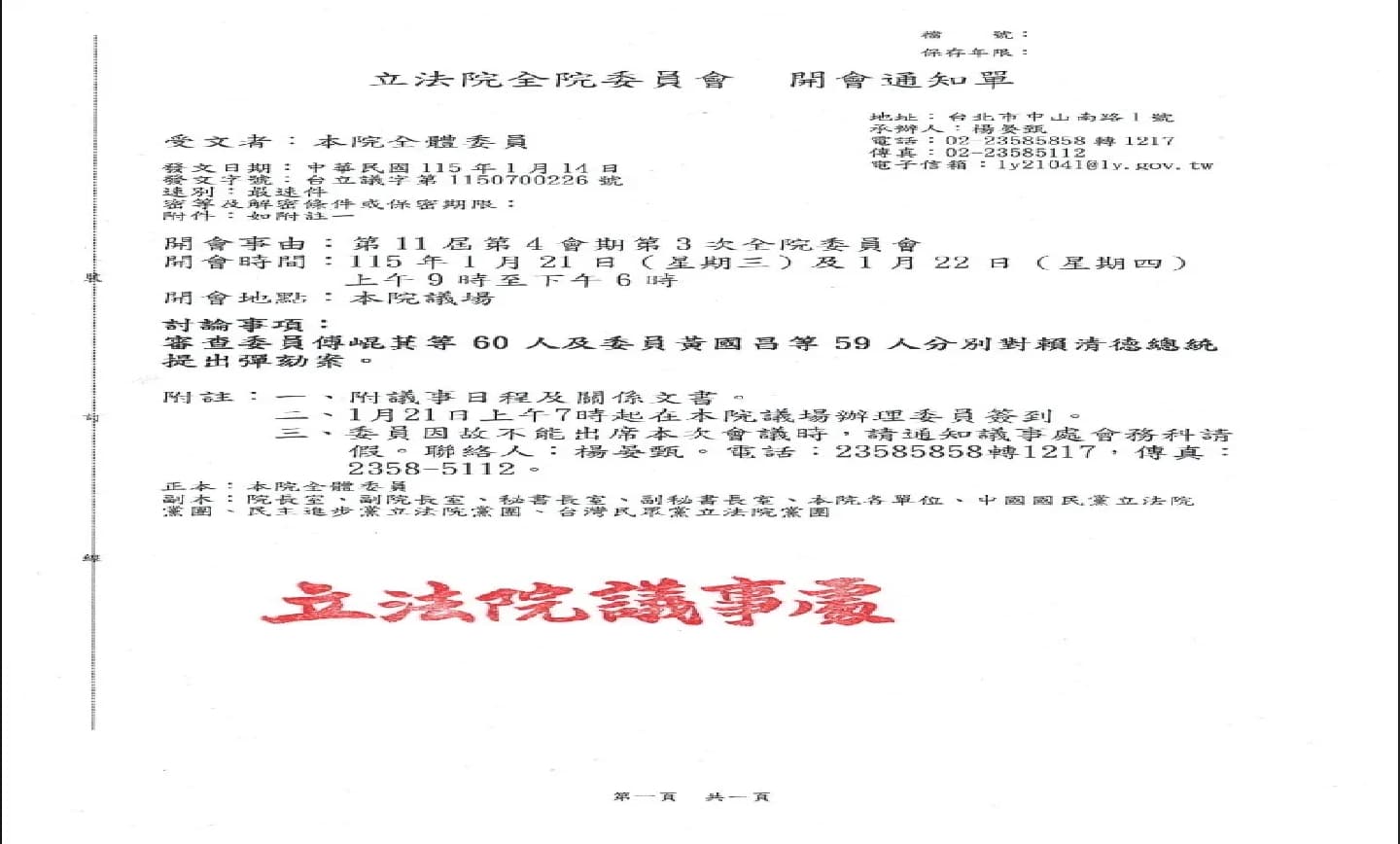 國民黨團、民眾黨團對賴清德總統提出彈劾案,立法院全院委員會已經舉行完兩場公聽會。立法院程序委員會13日表決通過,於21日、22日召開全院委員會邀請被彈劾人賴總統列席說明。立法院議事處今天已經發咨文給總統府,邀請賴總統於21日、22日赴立法院說明。