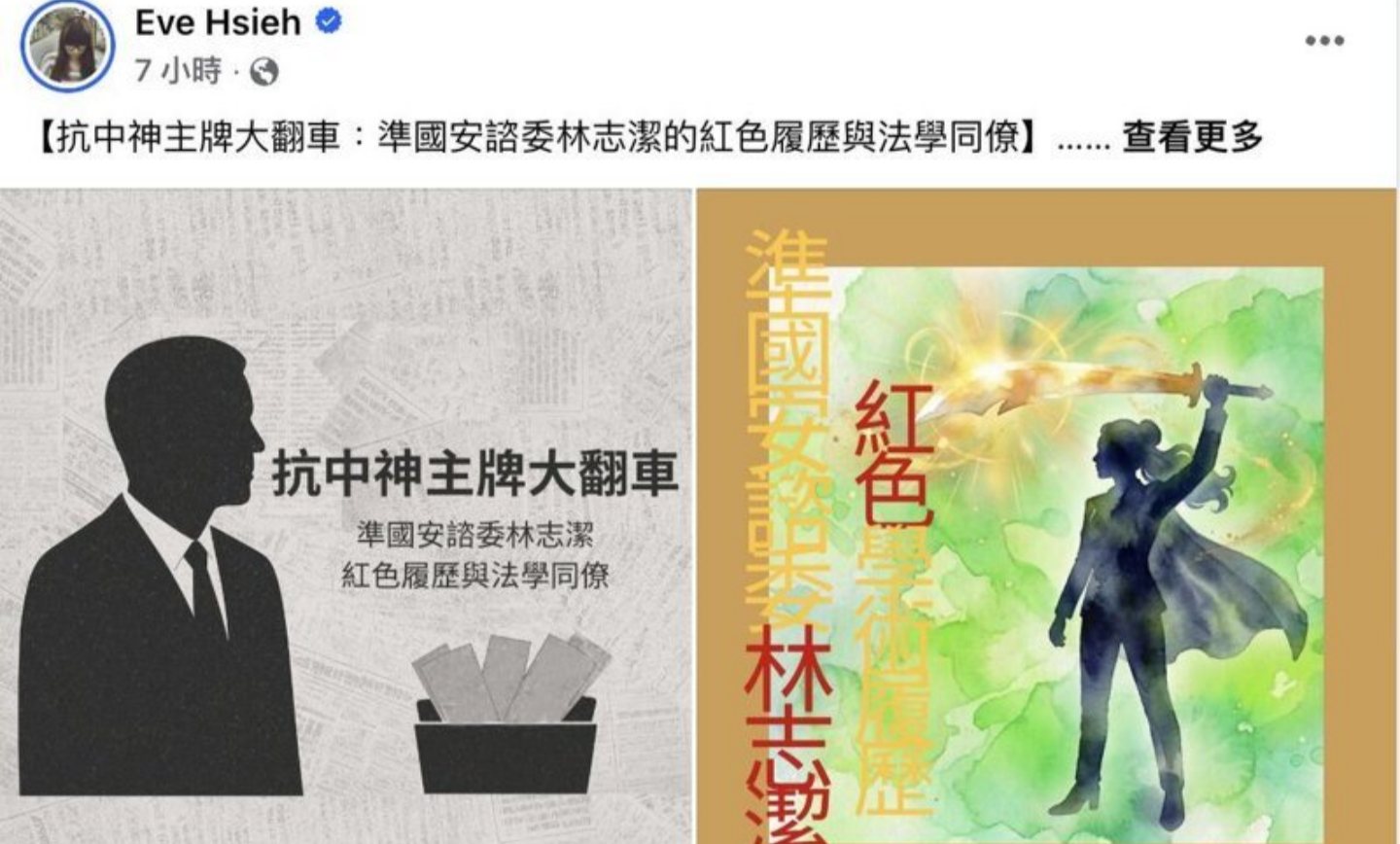 網友「Eve Hsieh」以「抗中神主牌大翻車:準國安諮委林志潔的紅色履歷與法學同僚」為題在臉書貼文表示,當執政黨將在野黨的中國學歷抹黑為統戰破口時;即將掌管台灣國安機密的準國安會諮委林志潔,卻曾在中國上海交通大學高掛「研究員」頭銜,這究竟是台灣國安防線的重大破口,還是綠色專屬的國安豁免權?